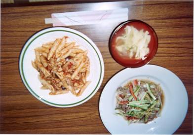 「牛肉の南蛮漬け、豚肉ときのこのパスタ」