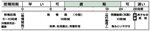 離乳から初回受精・初回受胎まで日増体重は0.7〜0.8kgが上限過肥にすると繁殖障害(不妊症)になりやすいので、体重と体高のバランスに気をつけて14〜15ヵ月令 体重300kg 体高115cmでの繁殖供用開始を目安に育成(体重が250〜300kgになると脂肪が蓄積しやすい体質になる) |