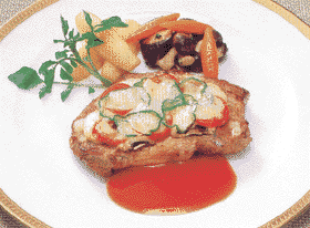 フライパンにサラダオイル、バターを熱し、@の豚肉の両面を手早く焼き、表面の脂気をキッチンペーパーでふき取り、玉葱、マッシュルーム、ミニトマト、ピーマンをのせていきます。最後におろしチーズを振り、オーブンで焼色をつけ仕上げにパセリを散らします。
