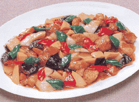 の合わせ調味料を入れ、煮立て、干椎茸・パイナップル・