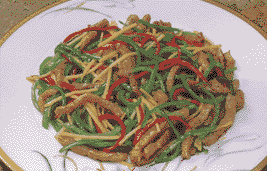 | 作り方 1.牛肉は5〜6cm長さの細切りにし、下味をつけます。 2.赤唐辛子は種をのぞき、生姜細切り、筍細切り、ピーマンは種を のぞき細切りにします。 3.小ボールに合せ調味料を作ります。 4.中華鍋を練鍋、サラダオイル50ccを入れ、赤唐辛子・生姜を軽く炒め、 1の牛肉を加えほぐすように炒めます。筍・ピーマンを加え炒め、 3をまわし入れ調味します。仕上げに胡麻油を加えます。 |